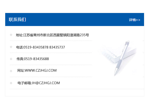 地址:常州市新北區友邦商務大廈1幢16、17層  電話:0519-85101652  傳真:0519-85112595  郵編:213022  網址:www_cz-jiayue_cn.91zhenti.com  郵箱:xiajifengaa@163.com